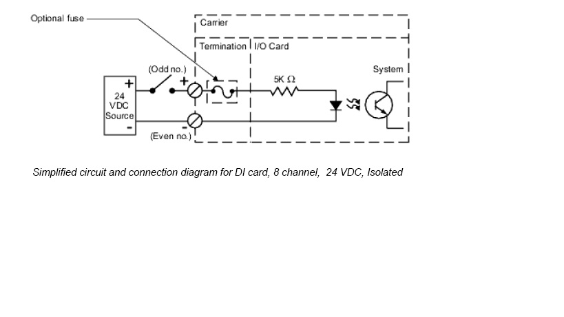 NB: la carte DI est de type isolé (la carte détecte le changement d'état par la détection d'une tension 24VDC externe).