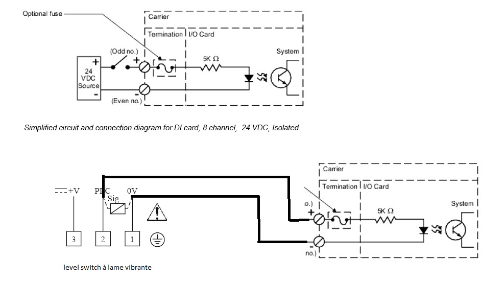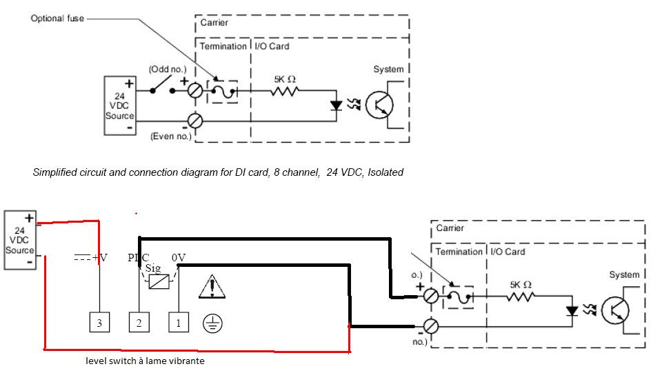 lorsque je branche le level switch sur la carte DI, l'indicateur du level switch clignote (d'après le manuel de level switch: load too high).
