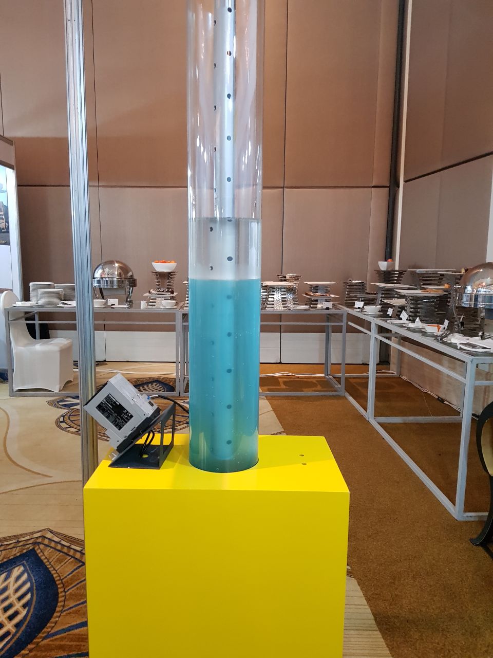 De plus, nos maquettes permettent de faire varier le niveau d'eau dans la colonne, via une pompe. Après quelque temps, l'huile commence à se mélanger un peu avec l'eau (à cause de l'agitation générée par la pompe) . Un mélange de plus en plus opaque commence à se créer... c'est pas top esthétiquement et ça fait passer une petite quantité d'huile dans ma pompe ( ce que j'aimerais éviter).