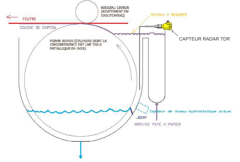 Depuis de nombreuses années, nous cherchons à mesurer le niveau de pâte dans les formes rondes de notre machine à carton. Autrefois nous avons eu des mesures par bulle à bulle (qui se bouchaient). Actuellement nous mesurons le niveau avec des capteurs hydrostatiques. Du fait de leur emplacement, la mesure est perturbée par la rotation de la forme (sans compter des phénomènes inexplicables). Quelqu'un aurait-il une idée pour mesurer ce niveau par le dessus, sachant que l'endroit est humide et qu'il y a risque de projections d'eau et de pâte. Est-il possible de mesurer en biais pour s'affranchir des ces projections?