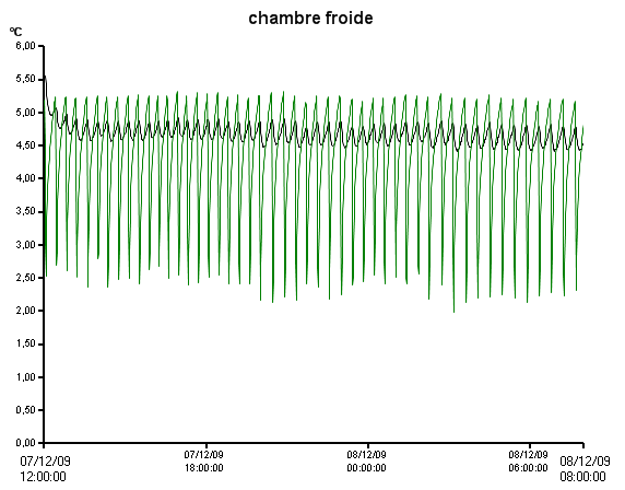 dernièrement j’ai fait une petite expérience sur une chambre froide en prélevant la température, j’ai utilisé un enregistreur de température qui a deux sondes différentes une qui est externe de type (SHT ambiance) et l’autre c’est une sonde qui se connecte a l’enregistreur qui est de type (sonde déportée CTN), lors du déchargement des résultats j’ai obtenue un graphe des deux courbe superposées.